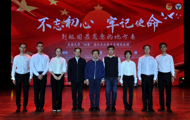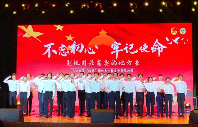 最后,举行2019年“四重”岗位就业意向学生宣誓仪式。学院6位应届毕业生代表(廖一龙,男,电路与系统2015级直博生,中国电子科技集团公司第十四研究所;朱传奇,男,信息与通信工程2016级博士生,中国电子科技集团公司第二十八研究所;傅随道,男,电磁场与微波技术2016级博士生,中兴通讯股份有限公司蓝剑计划;潘迪,女,信息与通信工程2017级硕士生,中国航天科技集团公司第八研究院803研究所;季一文,男,电磁场与微波技术2017硕士生,中国电子科技集团公司第五十五研究所;余倩,女,信息工程2016级本科生,中国航空发动机集团贵州黎阳航空发动机有限公司)与全校各专业到“四重”岗位就业的同学们一起庄严宣誓——“不忘初心,牢记使命”的担当在一代代东大人之间薪火相传。在宣誓仪式上,东大学子满怀豪情,宣告着东大人将坚定理想信念、砥砺高尚品格、秉承“止于至善”之校训,努力成为担当引领未来、造福人类的领军人才。